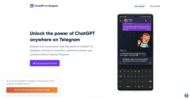 ChatGPT on Telegram is an AI powered bot that integrates the functionality of ChatGPT into Telegram's messaging platform. It is designed to provide AI conversation capabilities in any Telegram discussion. The bot is capable of answering queries, aiding in ideation and problem-solving, assisting in decision-making, and even assisting in writing emails. It can be used in both one-on-one chat and group settings.